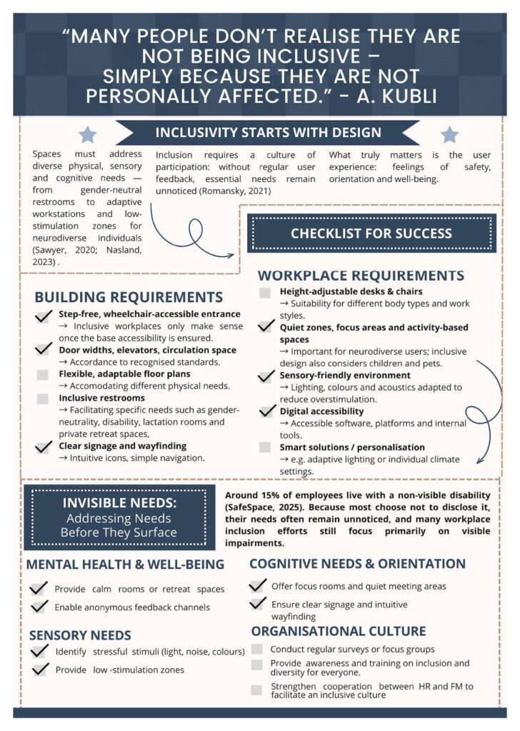 Based on these findings, we created an infographic with four interconnected pillars: Building Requirements, Workplace Requirements, Invisible Needs and Organisational Culture. It serves as a practical checklist and conversation tool. Overall, inclusive FM requires awareness, early planning, flexibility and continuous dialogue. Measures that promote inclusion ultimately create better workplaces for everyone.