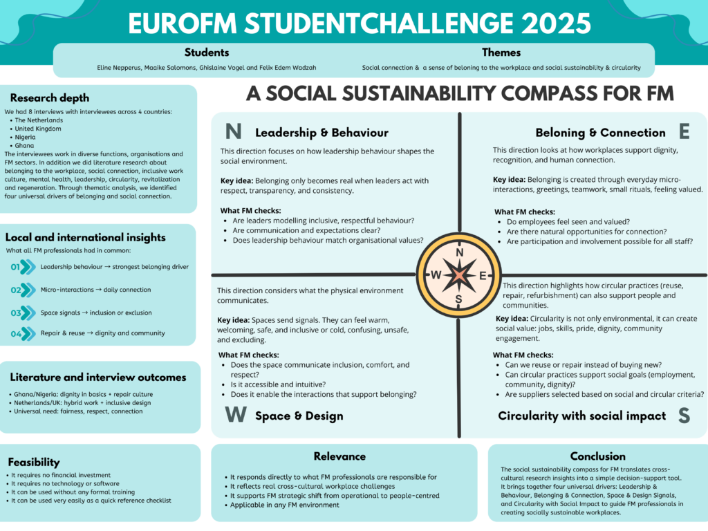 Building on these insights, the team translated their findings into a practical framework: the Social Sustainability Compass. Rather than prescribing fixed solutions, the compass functions as a reflective tool. It helps FM professionals recognise the social impact of their decisions and initiate conversations within teams, leadership groups and project environments. Its simplicity and visual structure make it applicable across organisations of different sizes and cultural contexts.